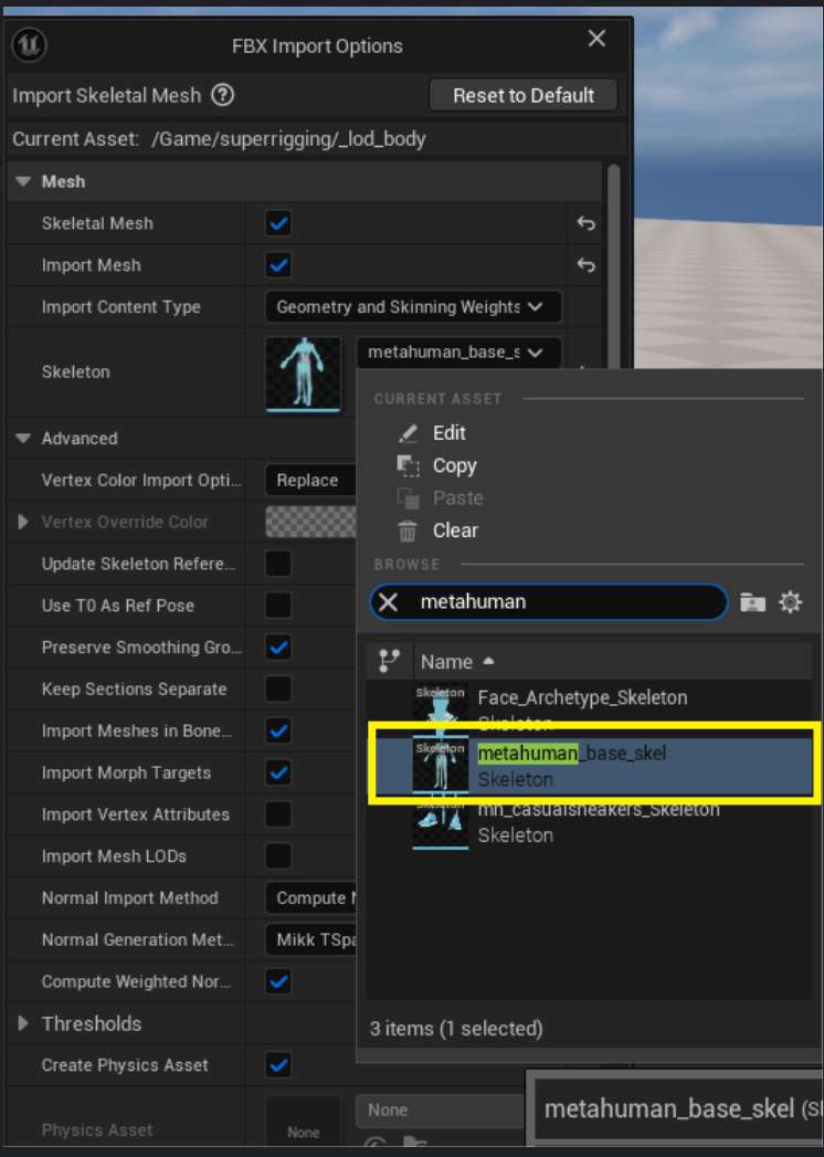 再來把身體的fbx檔丟進來,有一些設定需要設定,匯入的fbx檔Skeleton這邊要選擇metahuman_base!